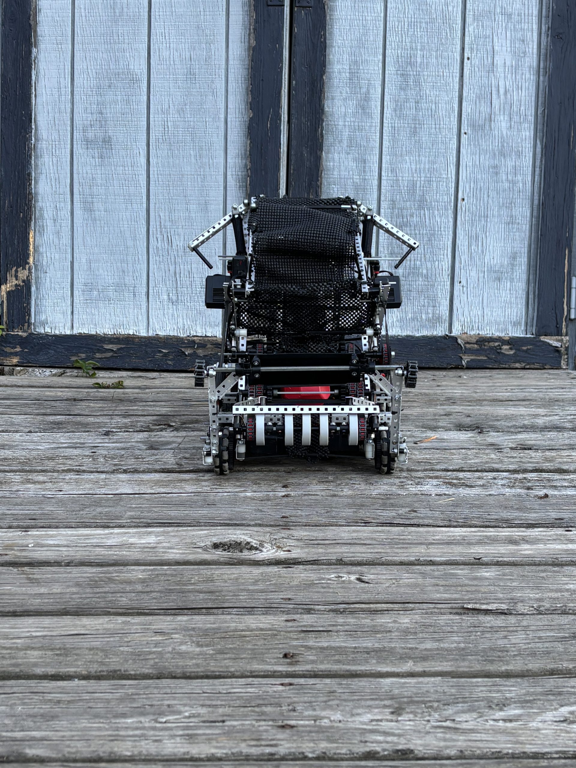 This season, our current robot features an S-intake system that allows us to efficiently hold up to 9 blocks using multiple optimized mechanisms throughout the design. We’ve focused on building a robust and reliable robot by using techniques like screw joints and boxing to strengthen the structure while keeping it lightweight and efficient.